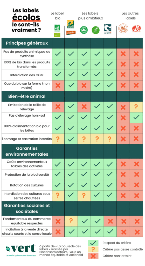 Si le label Agriculture Biologique est un repère précieux pour faire de bons choix de consommation, il présente aussi certaines limites souvent méconnues : une faible présence d’OGM reste tolérée, il n’exclut pas les exploitations de grande taille (des fermes industrielles peuvent donc être certifiées bio), il ne favorise pas les circuits courts ni l’origine locale des produits, et il ne prend pas en compte les enjeux du commerce équitable, comme la juste rémunération des producteurs. Pour aller plus loin et mieux répondre aux enjeux environnementaux et sociaux, d’autres labels existent et apportent des garanties complémentaires.